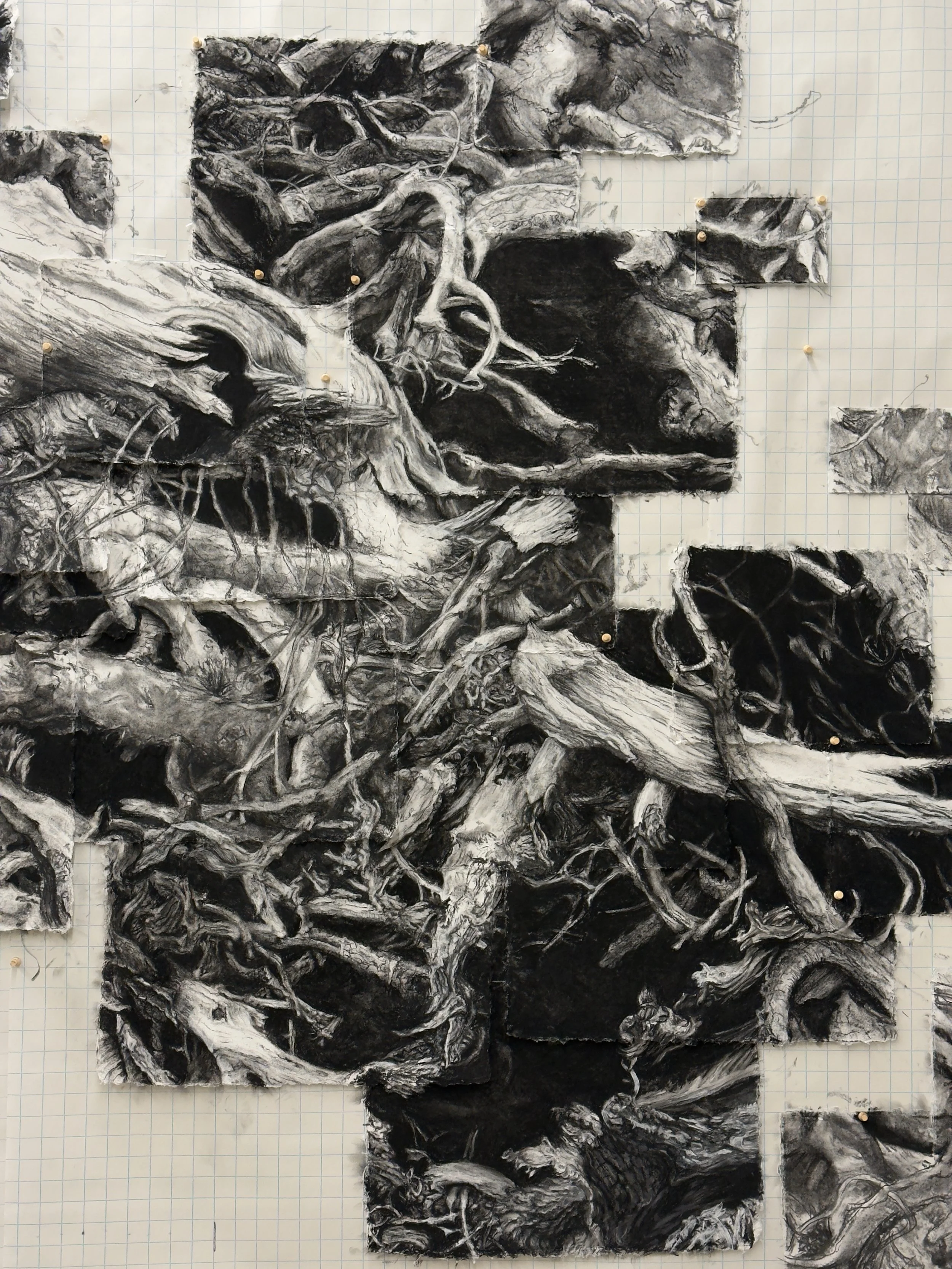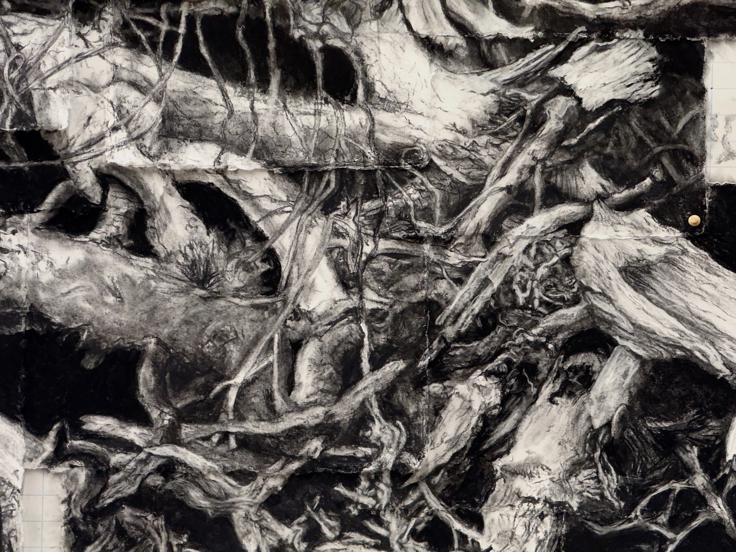 Gevurah belongs to a series of drawings titled “The Dead” inspired by trees in collapse and fragmentation as they surrender to their undoing. Form becomes matter, structure loosens into rubble, gesture becomes residue, and presence is carried forward as memory. Gevurah is both whole and fragmented. Spread across many sheets of paper, each page reveals a fragment of a larger whole, yet is a complete entity in itself. The structure recalls how we build understanding: piecemeal, never complete, always evolving. The surface insists on its flatness but depicts a space that invites the body to step inside. Rendered in charcoal—the ash of burnt trees—Gevurah lingers in the moment of fertile unraveling when contained energy is released through destruction, enabling regeneration. In this way, it mirrors our current moment: uncertain, uncomfortable, ambiguous, yet rife with possibility.